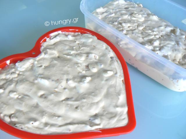 Cookies, milk and vegetable cream. All well beaten and mixed together. Sprinkled with a sweet, home made, caramel flavor.
