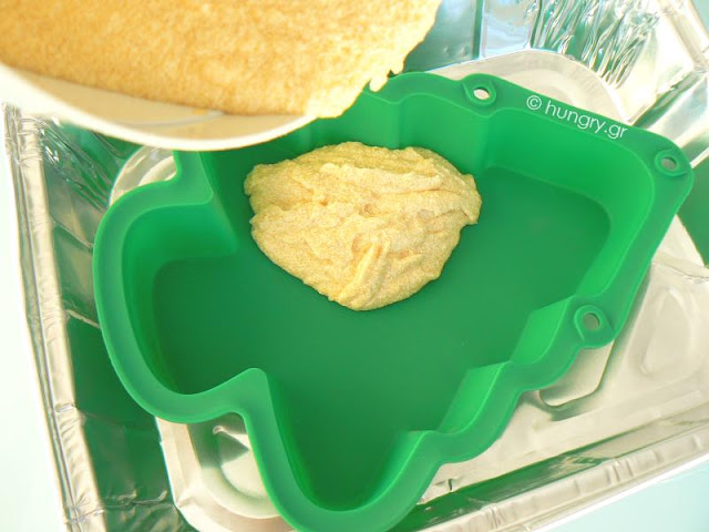 Grease and flour a form 22cm/ 9", in the shape of a Christmas tree and pour the mixture into the cake. Spread carefully with a spatula. |