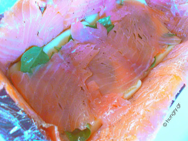 Cover the salmon with basil leaves. Repeat, until you run out of ingredients. |