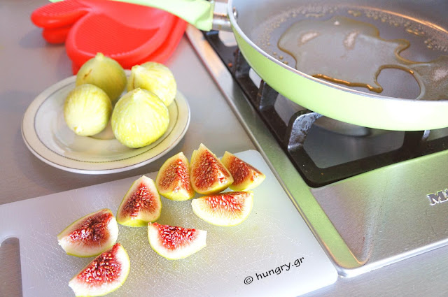 Place it over medium heat and leave, without stirring, to begin to melt the sugar and caramelize slightly. Chop the figs in 4 and put them into the pan. |