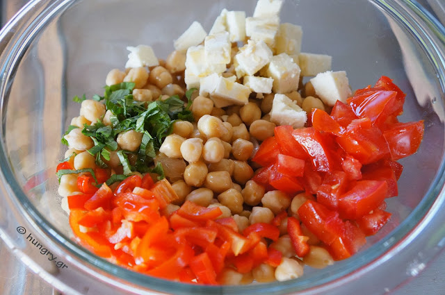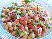When the chickpeas are cooked, strain, discard and throw in the carrots and the onion. Put in a large bowl and add the feta cheese and the remaining ingredients. Sprinkle with olive oil and salt and pepper. Mix well and serve on plates. |