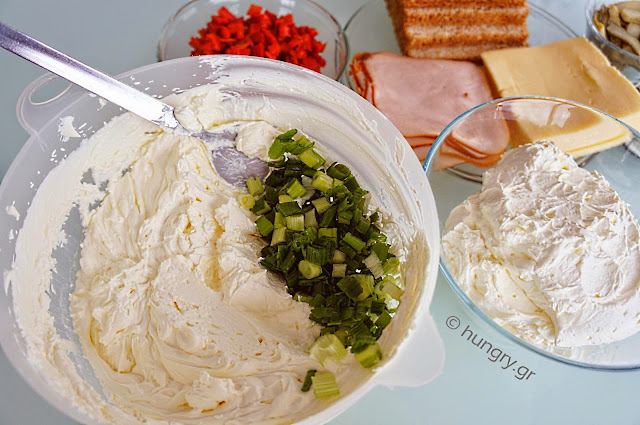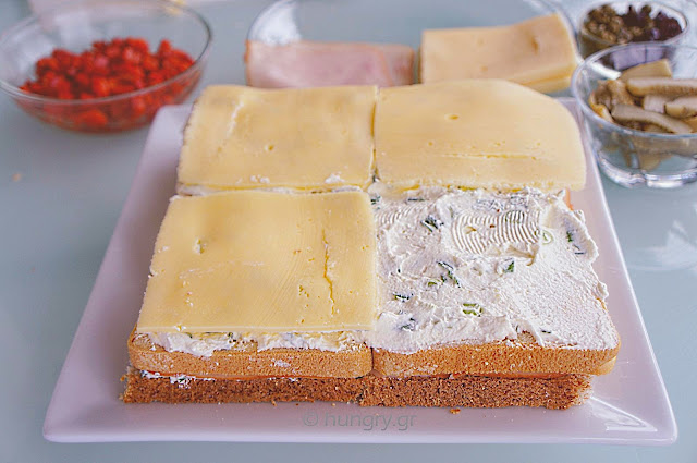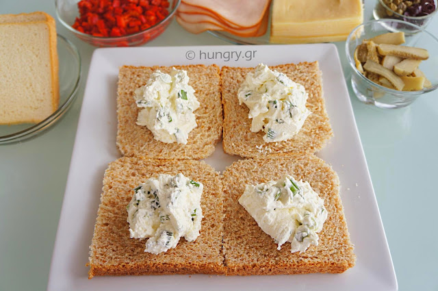 Spread the bread again with the mixture of cream cheese / onion and cover with slices of cheese. Cover with slices of bread. |
