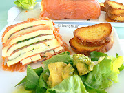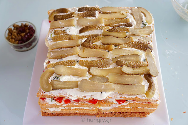 Repeat the same in the fourth layer, placing 4 slices of bread and spreading the last dose of the mixture of cream cheese/ onion. Cover with pickled cucumber, few olives and some capers. |