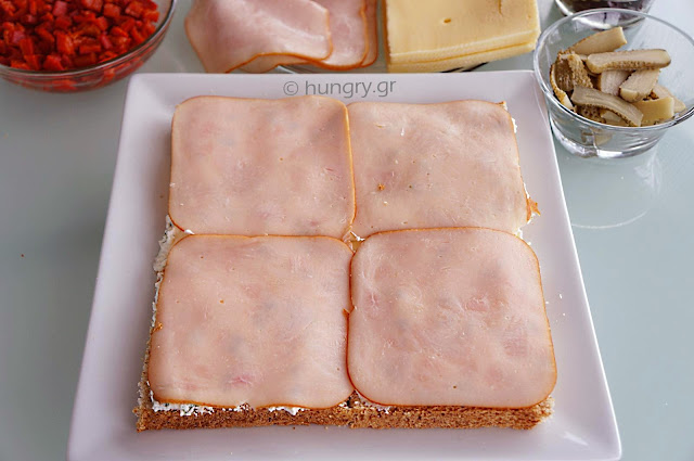 Above the first layer of cream put slices of ham. Cover with another 4 slices bread. |