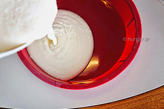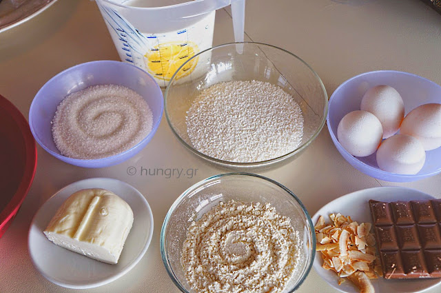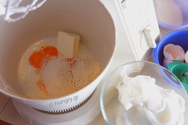 Transfer the meringue in a bowl and put in the mixer the egg yolks, the sugar, the butter and the coconut. Beat on 1'-2' and add the milk and flour, mixed with baking power, in three installments, beating at medium speed. |