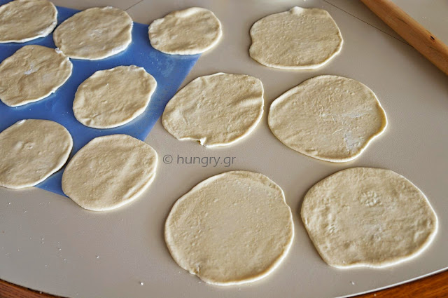 Press each ball with your hand or with a rolling pin to create a flattened disc as saucer of Greek coffee. Within each dough disc place a little ball cream cheese. | Enclose the ricotta, by covering it with the dough, as a closed pouch. Place the ball on the desktop (non stick) with the compound down. | By hand press each ball slightly to widen. With a rolling pin and with very gentle strokes form a round tray ∼18cm (7.1 in). |