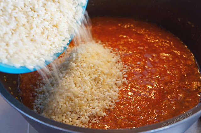 … and bring to boil. When the first boiling craters appear add the rice. |