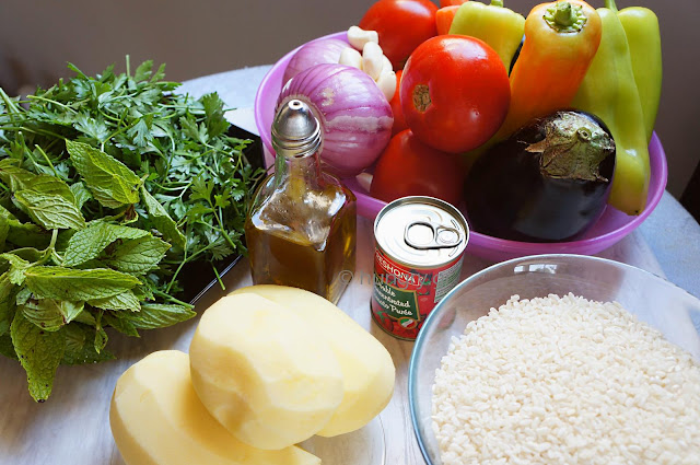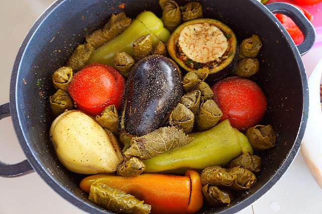 A variety of favorite vegetables, stuffed with rice and the crumb inside the casserole flavored with onions, mint and parsley. It is our One-Pot Meal. Everything in one!