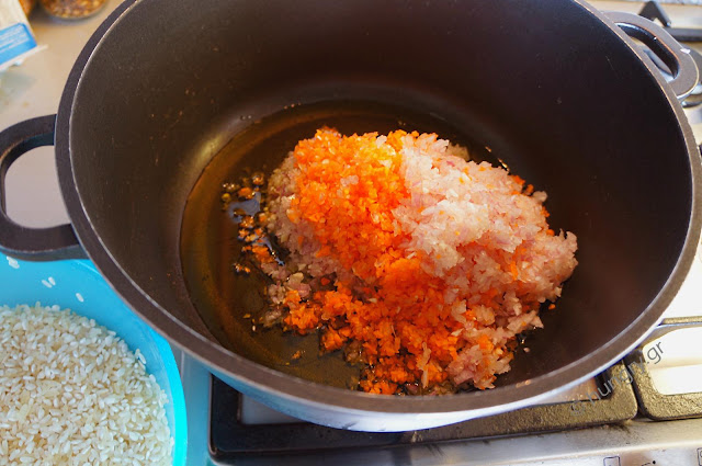 In large saucepan, in the same that you will cook the stuffed vegetables, put half the oil, pureed onions, garlic and carrots. Saute briefly to polish. Simultaneously wash the rice and drain. |