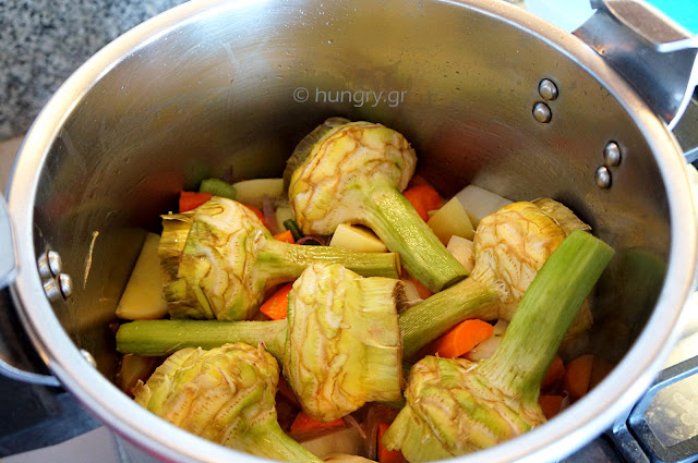 Older cooks from us, certainly they know it and cook it excellently. But there are newer, which would like to try to make it. It's a bit troublesome with regard to cleaning the vegetables and the artichoke, but it is a tasty and healthy food. The vegetables, sources of vitamins, minerals and fiber, are cooked easily and quickly and still remain juicy and delicious.