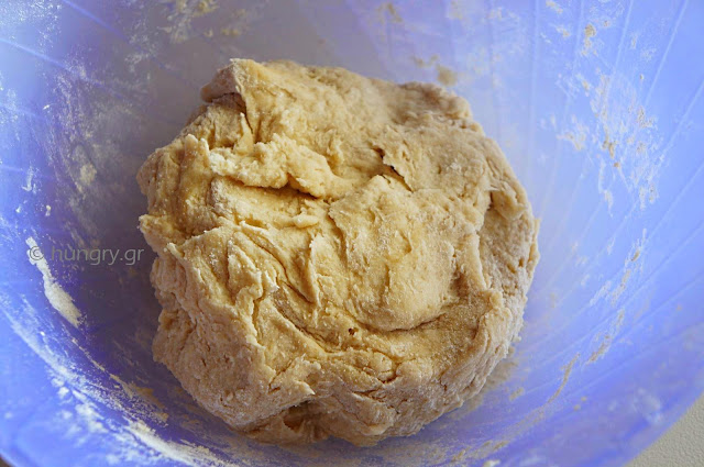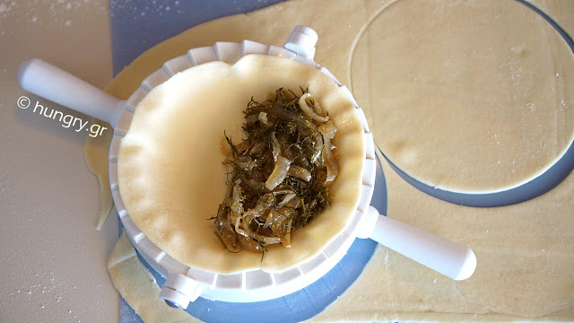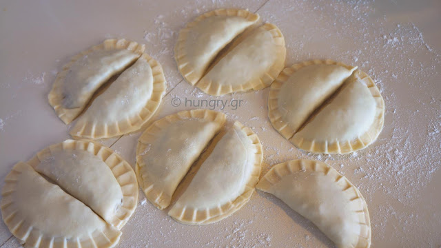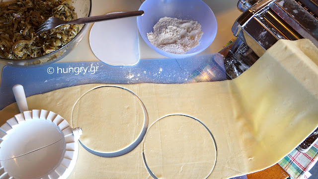 Mix together the ingredients for the dough, knead it for a while and let it for 15' covered. | Roll by hand or with dough machine. Cut disks Ø12 cm (Ø4.7 in). | Fill each half of the dough disc with some of the stuffing. We close blanketing the other half. |