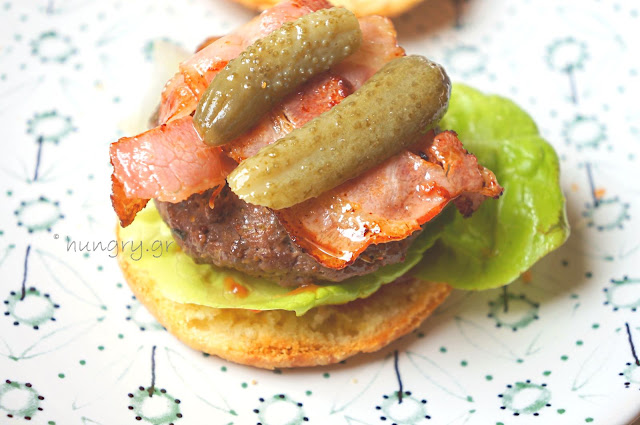 On top of each bun place a lettuce leaf, a grilled burger, two bacon strips crosswise and a pickled cucumber, cut in two along… |