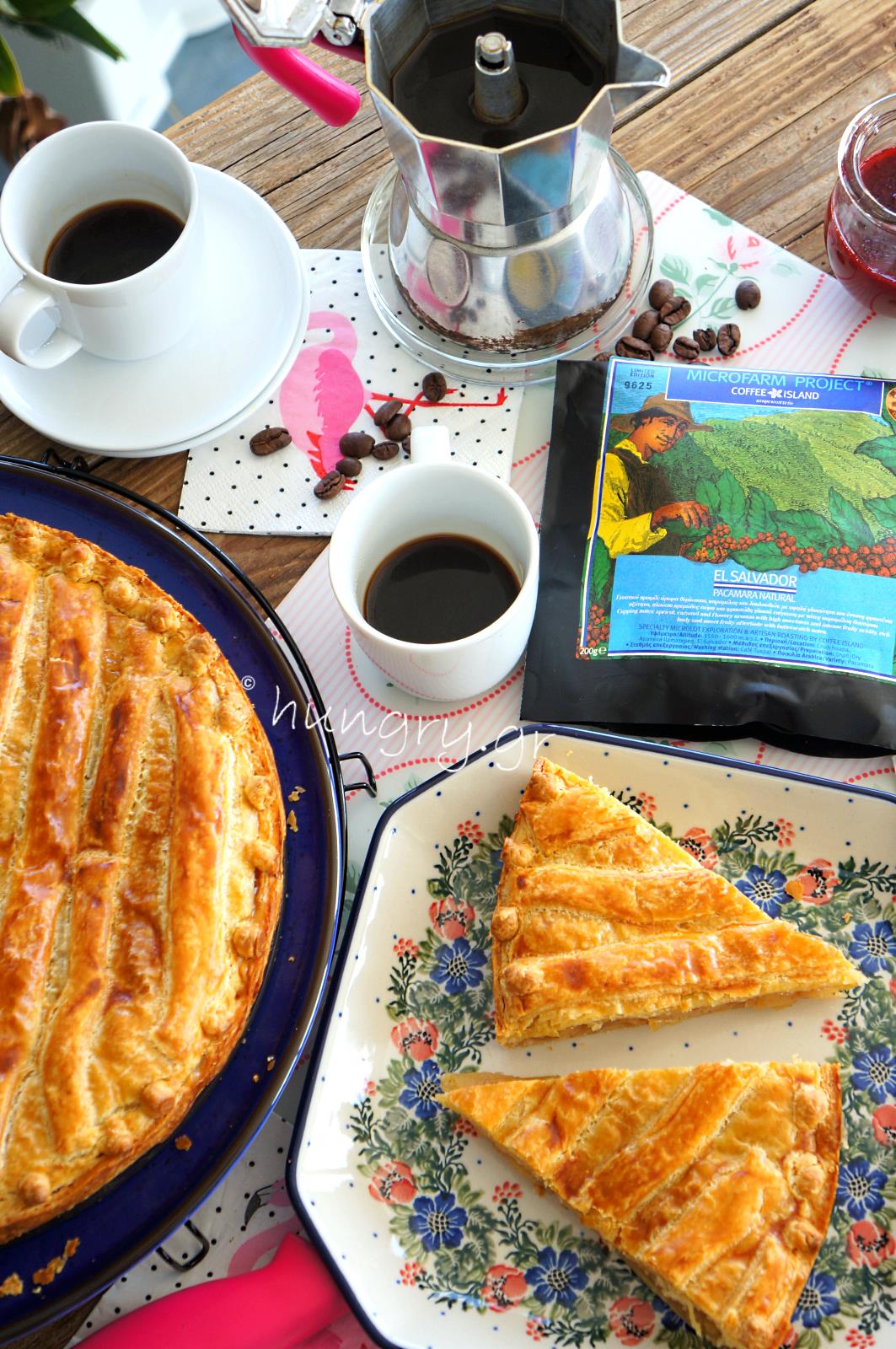Bake on the lower rack in a preheated oven, with air at 190℃ (374℉, Gas Mark:5) for 35'-40'. In the last 5 minutes place the form onto the bottom of the oven to bake the puff pastry well and underneath. Allow to cool 10 minutes after you take it off the form and let it get lukewarm. Served and eaten warm and dusted with powdered sugar optional. |