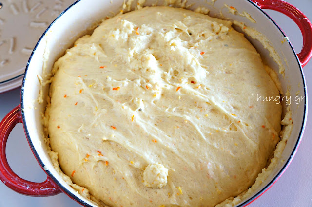 Add the dry yeast, stir and let it sit for 1′. | Add the flour, gum, cardamom and orange zest. | Mix well with a wooden spoon for about 1′. The dough will be very sticky. |