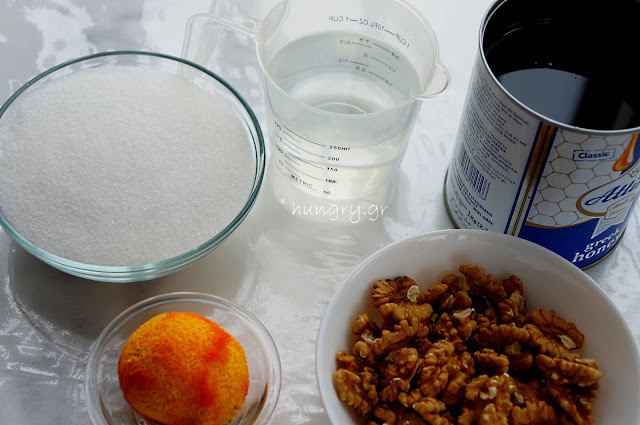 Put the syrup ingredients in a pot, except walnuts and spices in powder. Boil for 4' from boiling. Remove the foam when it is created. |