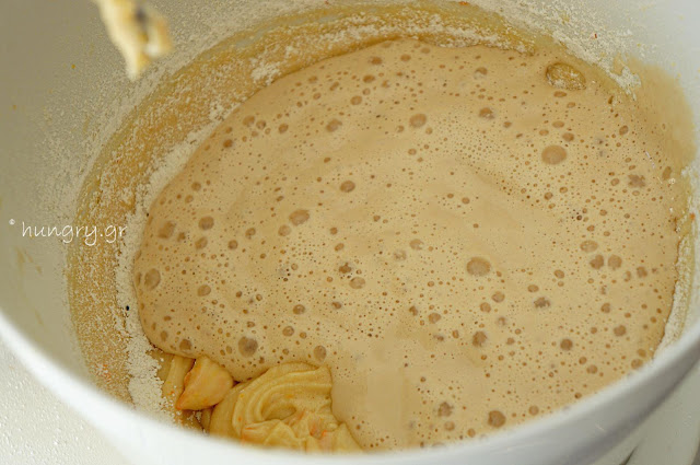 Add by tapping or by hand stirring the orange juice and zest, mastic and flour gradually. |