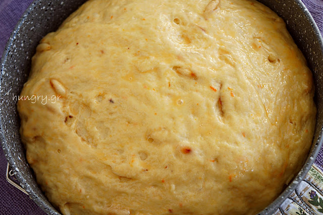 … which is placed in a non-stick form with Ø24cm (Ø9.4in), oiled with detachable sides. Press the dough gently with your palms to spread a little. Cover it again and let it warm up for 45′. |