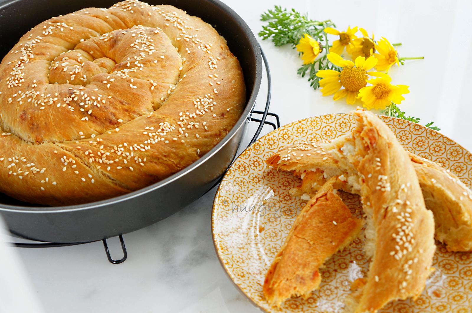 Place one end of the cord in the center of an oiled round oven with Ø28 cm and wrap the rest of the cord around itself as a spiral. Bake the spiral and sprinkle sesame. Bake in a preheated oven with resistors at 180℃ (356℉) for ~45' until it rinses red and the base is well baked. |